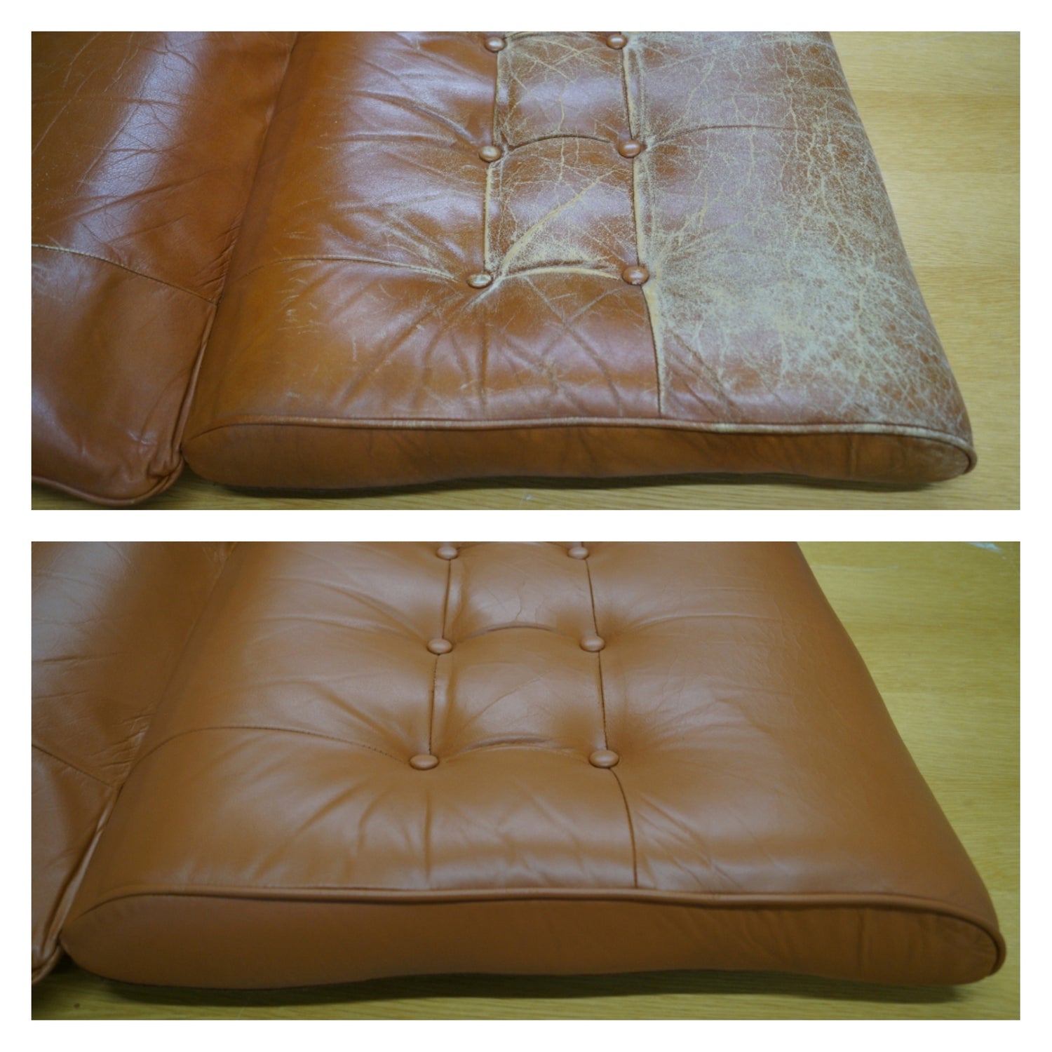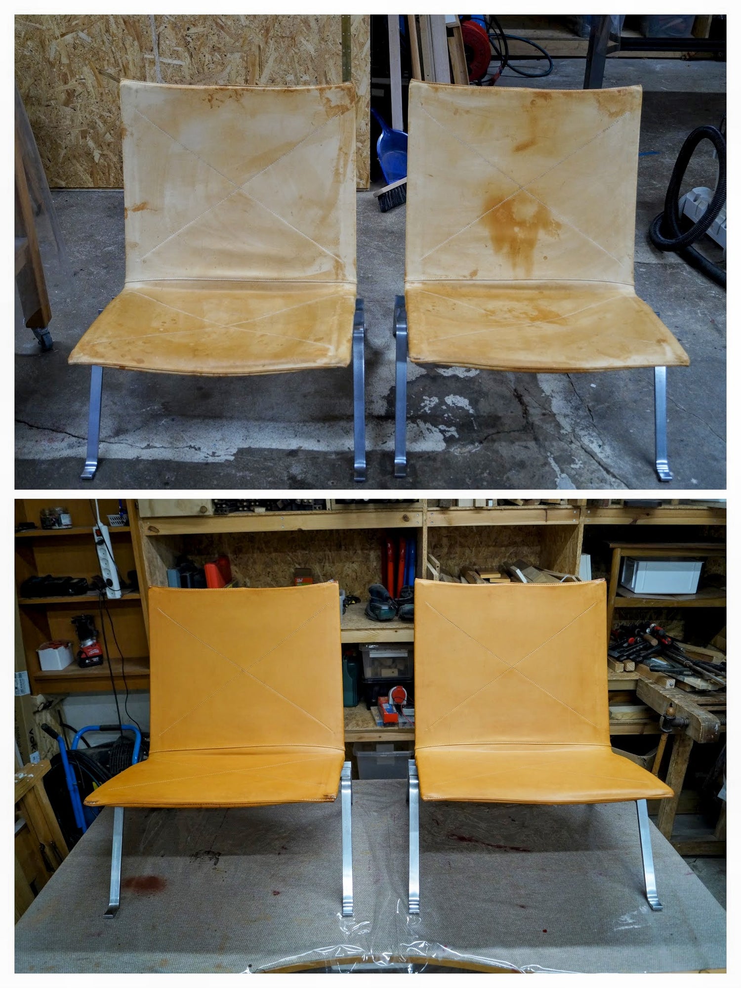 Efter knap 40 års brug og slitage var alt farve slidt af og læderet lignede ruskind. Læderet fik en grundig rensning, renovering af små huller og revner og derefter indfarvning. Til sidst afsluttet med beskyttelse.